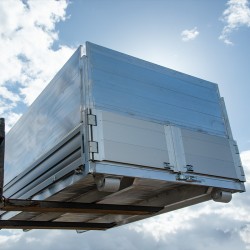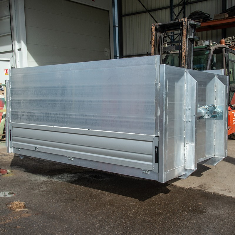 Cette benne à ridelles en aluminium brut est légère et résistante, et elle bien adaptée au transport de déchets verts corrosifs tels que l'herbe tondue. Nous réalisons des bennes amovibles en aluminium à des dimensions personnalisées avec différentes options, telles que des ridelles qui se transforment en plateau, la présence de portes à 2 vantaux ou l'ajout d'un système de bâchage.